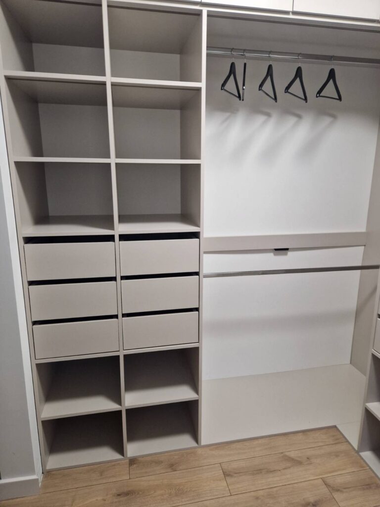 Oto przykładowa realizacja w eleganckim kolorze kaszmiru, zintegrowana z oświetleniem LED oraz funkcjonalnymi rozwiązaniami – szufladami, półkami i drążkami na ubrania.